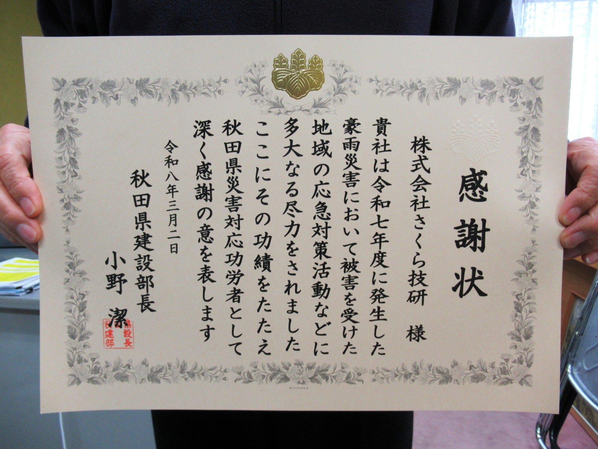 秋田県仙北地域振興局様より感謝状をいただきました。